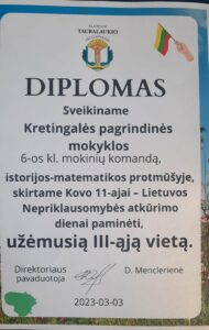 Kovo 3 d. Klaipėdos Tauralaukio progimazijoje vyko istorijos-matematikos protmūšis, skirtas Lietuvos Nepriklausomybės atkūrimui. Mūsų mokyklai atstovavo 6 klasės mokiniai: Raminta Bulvonaitė, Akvilė Lubytė, Aušrinė ir Gintaras Aleksiūnai. Protmūšyje savo žinias tikrino atlikdami interaktyvias užduotis, spręsdami kryžiažodžius, skaičiuodami, skaitydami diagramas ir t.t.
