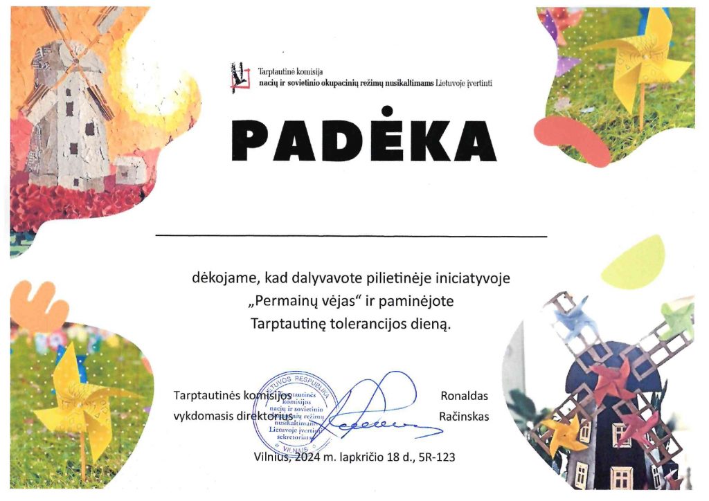 Džiaugiamės galėdami pasidalinti, kad mūsų mokykla sulaukė padėkos už aktyvų dalyvavimą Tarptautinės tolerancijos dienos veiklose.