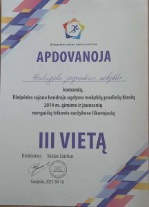 Balandžio 16 d. Klaipėdos rajono bendrojo ugdymo mokyklų pradinių klasių mergaičių trikovės varžybose mūsų mokyklos 3–4 klasių komanda (K. Kuršytė, M. Liutkevičiūtė, P. Ivanauskaitė, U. Turauskaitė, V. Liutkevičiūtė) užėmė 3 vietą.