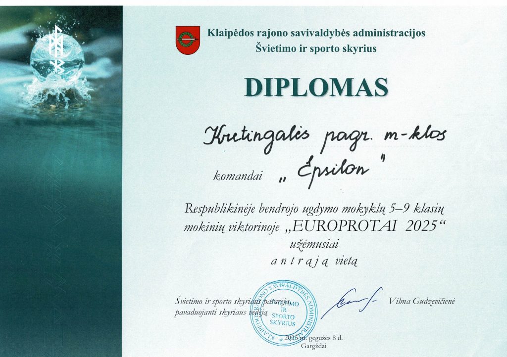 Respublikinėje bendrojo ugdymo mokyklų 5–9 klasių mokinių viktorinoje „Europrotai 2025“ mūsų mokyklos komanda: J. Zeicas, A. Arlickaitė, S. Daukantas, M. D. Jankauskaitė ir G. Aleksiūnas – iškovojo II vietą! Sveikiname ir dėkojame istorijos mokytojai J. Rackevičienei, subūrusiai šaunią komandą.