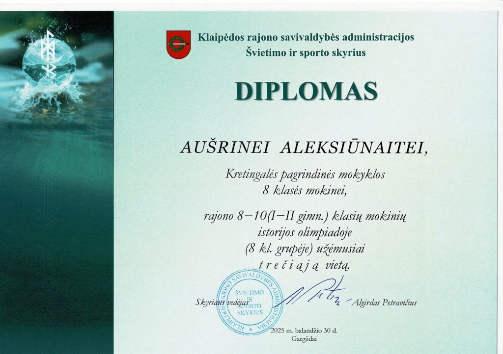 Klaipėdos rajono 8–10 (I–II gimn.) klasių mokinių istorijos olimpiadoje mūsų mokinės pelnė prizines vietas! Sveikiname laimėtojas ir jas olimpiadai ruošusią istorijos mokytoją Jūratę Rackevičienę.