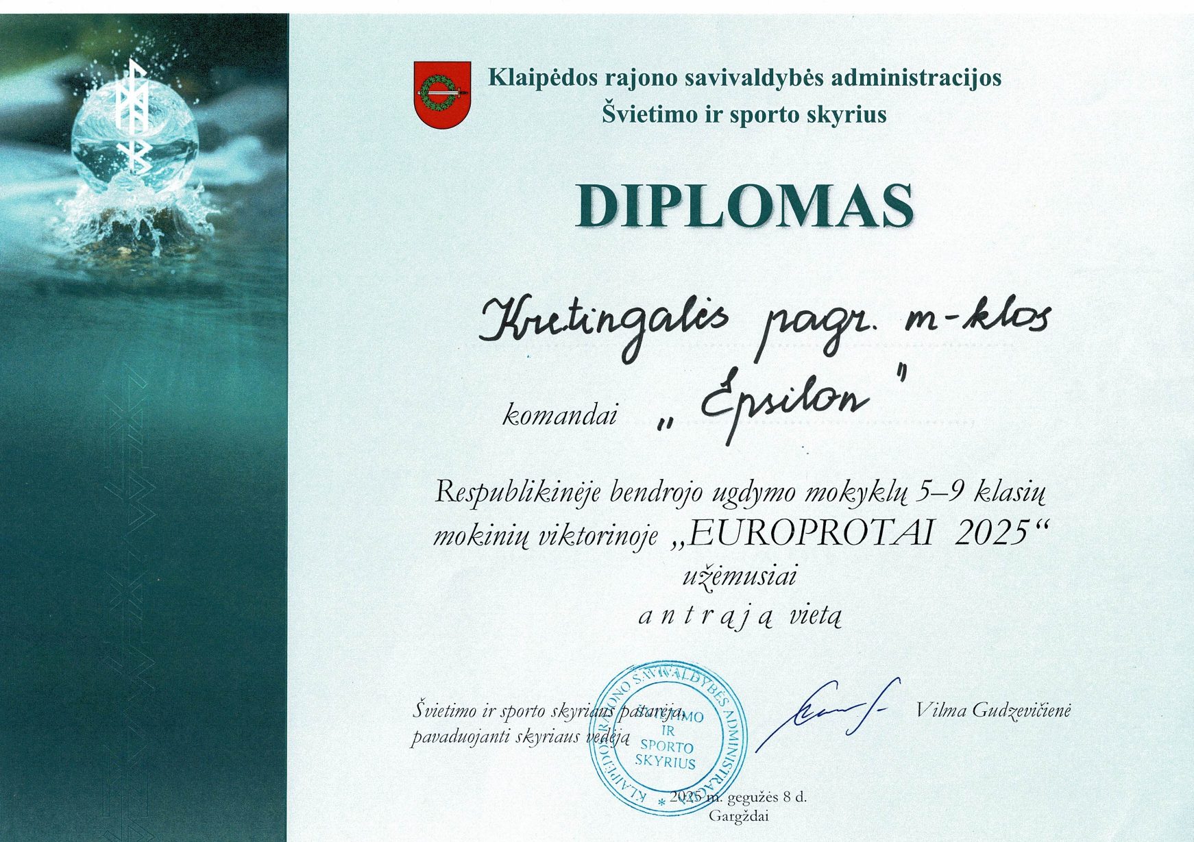 Respublikinėje bendrojo ugdymo mokyklų 5–9 klasių mokinių viktorinoje „Europrotai 2025“ mūsų mokyklos komanda: J. Zeicas,