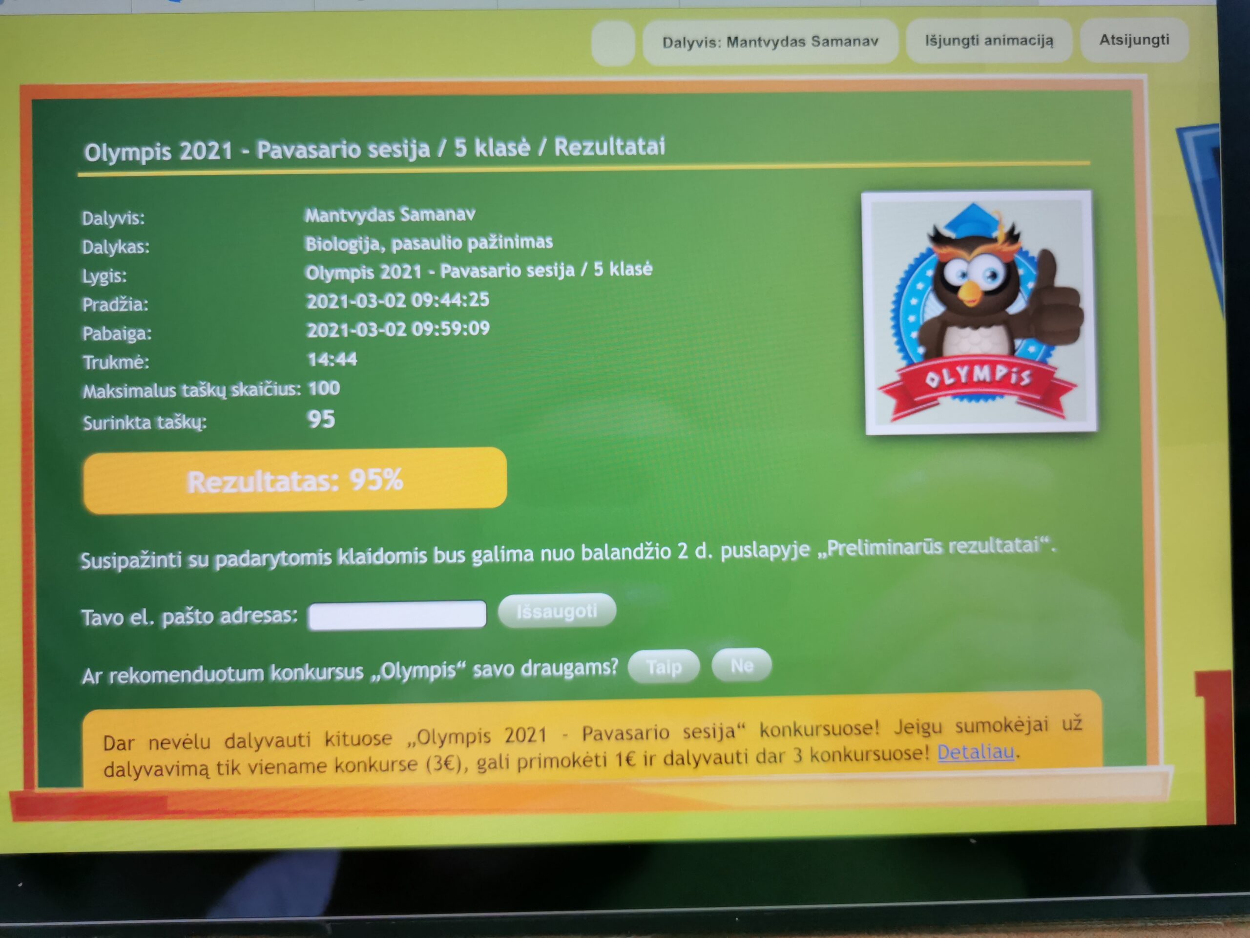 Sveikiname 5 klasės mokinį Mantvydą Samanavičių laimėjus I-ojo ir II-ojo laipsnio diplomus biologijos/ pasaulio pažinimo